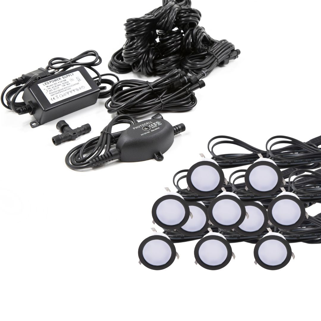 Slip for bekymringer om kabler og tilbehør – med dette komplette gør-det-selv-kit får du alt, hvad du behøver for at skabe en stemningsfuld udendørsbelysning. Uanset om du vil integrere lamperne i træterrassen, fliserne eller indkørslen, kan du komme i gang med det samme!
